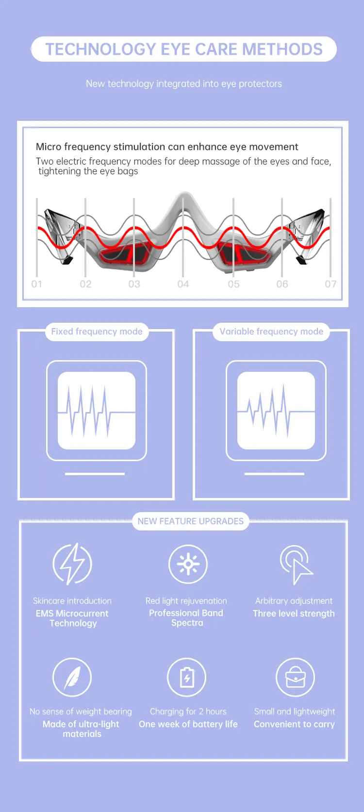 Lightweight, ergonomic fit with simple operation. Just 10 minutes a day for an on-the-go “eye rejuvenation boost.”